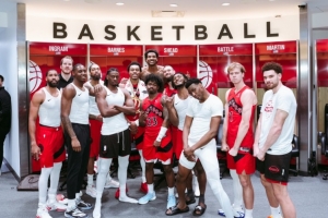 赛后,猛龙全队在更衣室拍摄全家福庆祝胜利,斯科蒂·巴恩斯获戴本场最佳球员的大金链子。