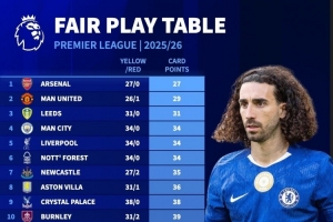 本赛季英超公平竞赛积分(积分越少代表吃牌越少)