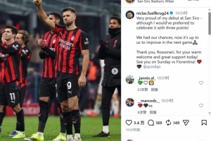 菲尔克鲁格社媒写道:“为我在圣西罗的首秀感到非常自豪,尽管我更希望能以一场胜利来庆祝!