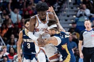 鹈鹕与太阳比赛第三节末段,“老六”阿尔瓦拉多与马威发生冲突!