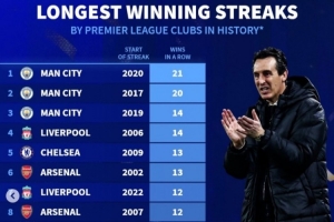 英超球队历史各项赛事最长连胜榜: