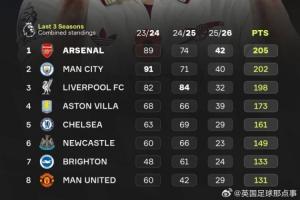 433统计最近三个赛季英超总积分:阿森纳排名第一,维拉与纽卡也成功跻身前六🤯