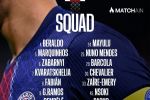 体育资讯1月16日讯 北京时间明天凌晨4点,巴黎圣日耳曼将在法甲第18轮比赛中主场对阵里尔,巴黎圣日耳曼公布了此役的球员名单。若昂·内维斯肌肉不适缺席。