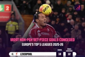 体育资讯12月30日讯 Opta统计了本赛季五大联赛球队定位球的失球数量(不包括点球),并列出榜单,利物浦12球居首,这也是2015-2016赛季(15球)之后,利物浦定位球失球最多的赛季。