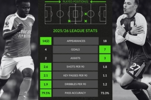 体育资讯12月31日讯 英超赛季上半程最后一轮比赛,阿森纳将和维拉交手。本场比赛之前,WhoScored对两队进攻核心萨卡及摩根·罗杰斯的数据进行了对比。
