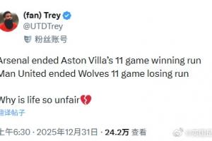 曼联球迷:阿森纳终结了维拉的11连胜,曼联终结了狼队的11连败,为什么生活这么不公平!💔