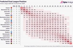 体育资讯12月31日讯 2025年英超比赛结束,半程过后,枪手领跑英超积分榜。