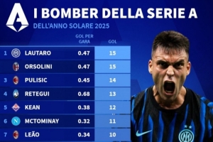 体育资讯1月1日讯 德转列2025年意甲射手榜,劳塔罗与奥尔索里尼15球并列第一。
