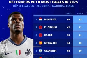 体育资讯1月4日讯 《转会市场》统计了2025年前十联赛后卫的俱乐部+国家队各项赛事进球最多情况,邓弗里斯居首。