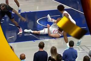 刚开场64秒,火箭中锋申京抢篮板落地踩脚受伤,表情痛苦,已回更衣室。