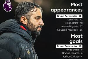 体育资讯01月05日讯 在阿莫林下课后,英超官方晒出了阿莫林执教期间,曼联球员的各项数据,B费在出场数、进球数、助攻数上都是最多的。